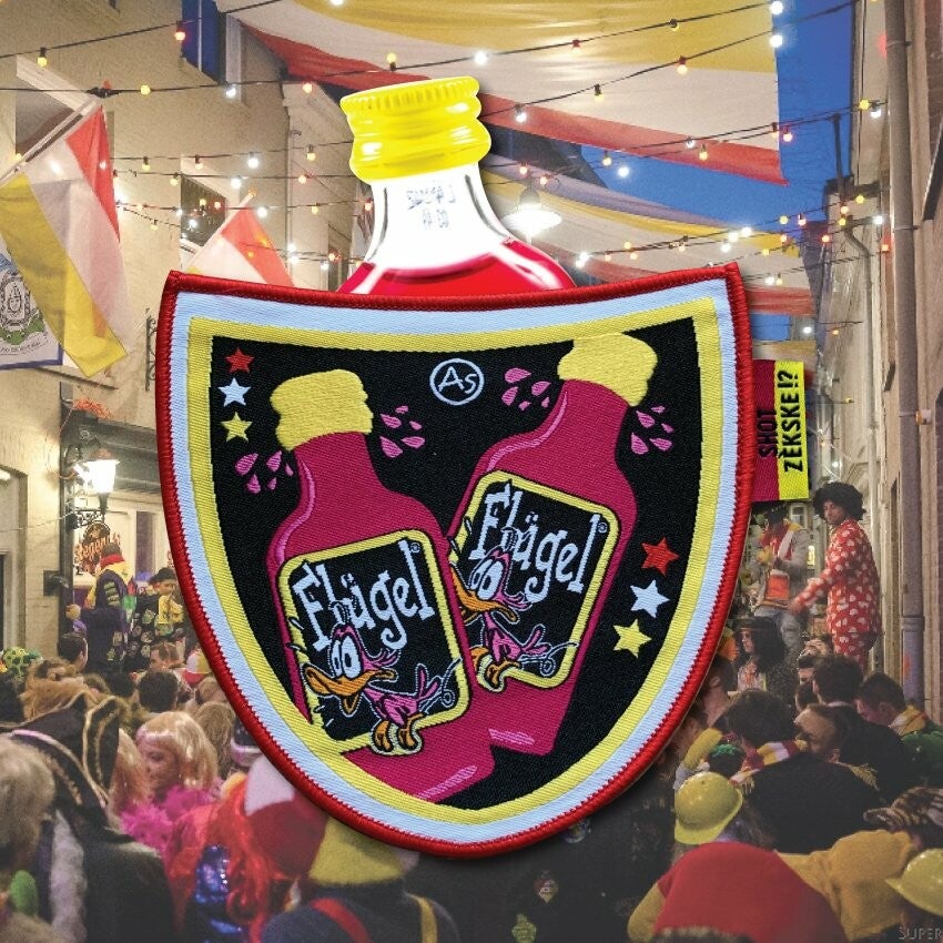 Stik het embleem rond om vast maar laat de bovenkant open....Flugeltje in het zèkske en door... !