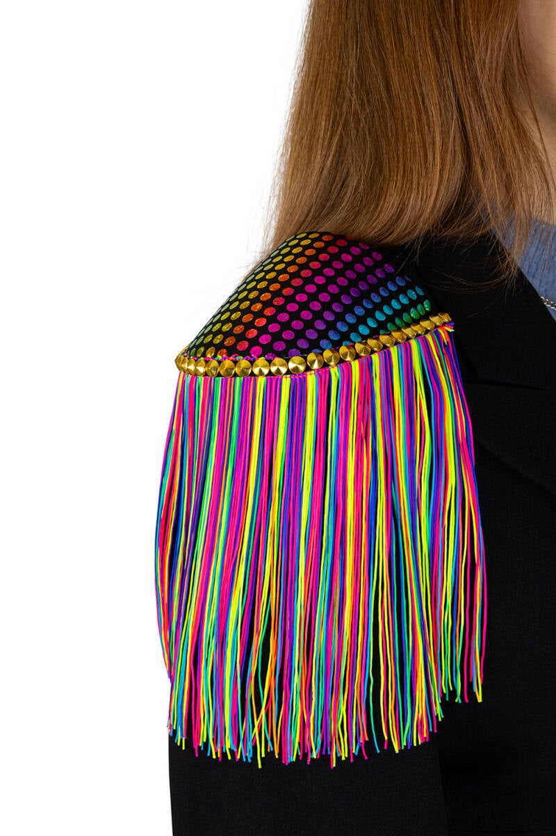 Epaulette met meerkleurige shiny dots en meerkleurige neon franjes met gouden studs per paar.Met speld om te bevestigen.